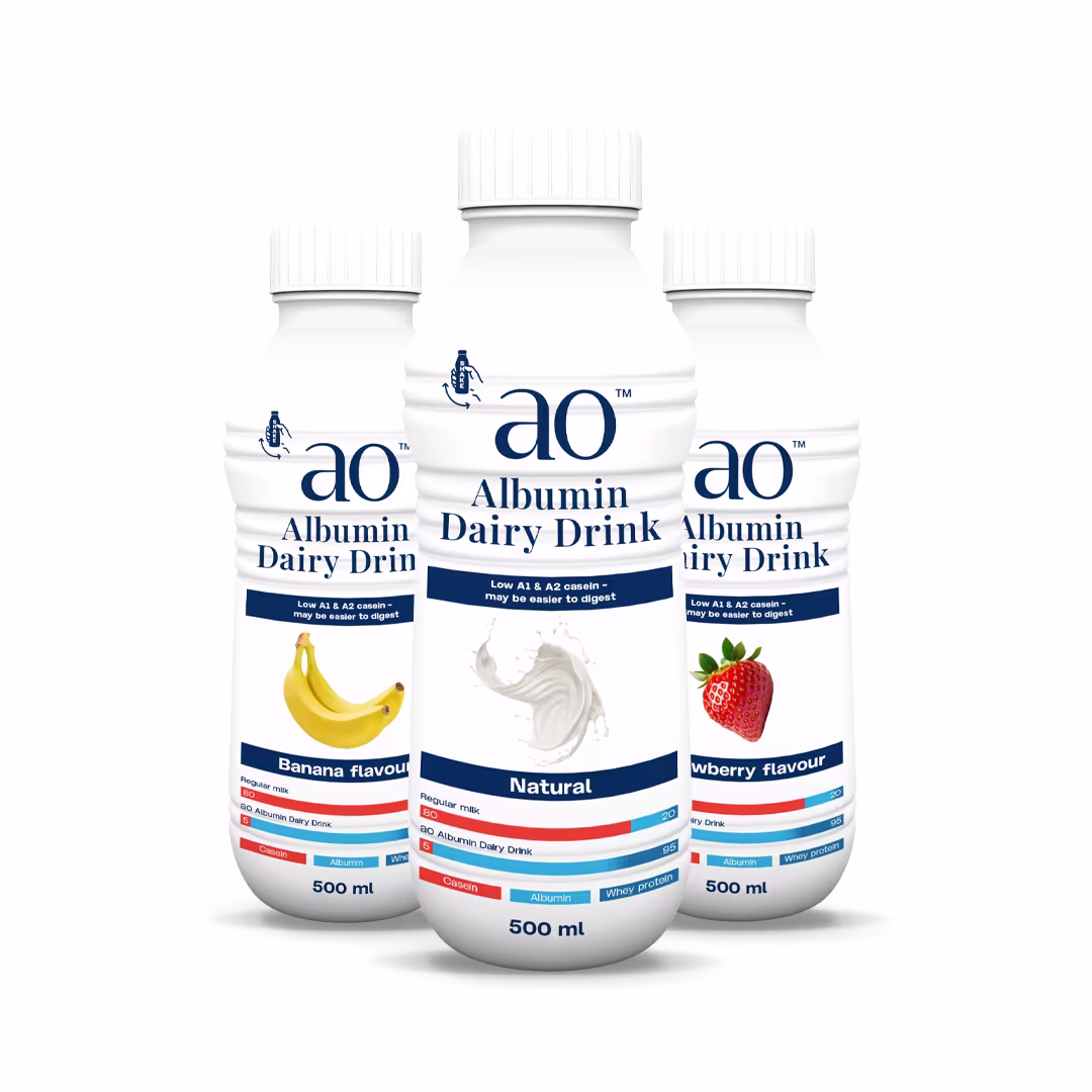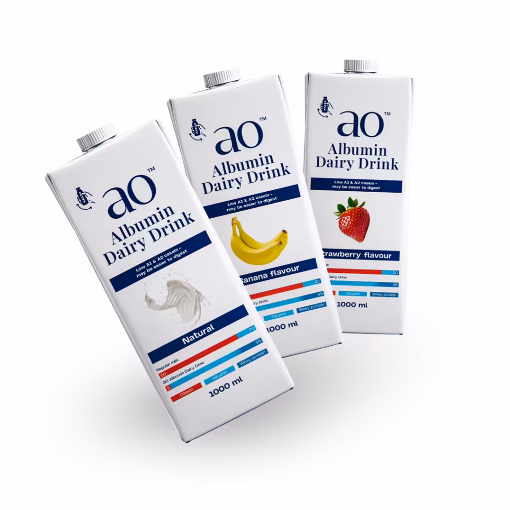 a0 Dairy Drink contains 20 – 30 g of whey protein per litre. Whey proteins are high-quality proteins that are efficiently absorbed by the body.